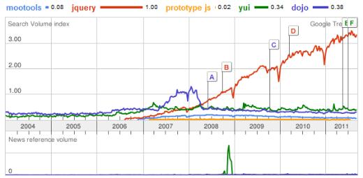 用google趨勢的數據來看,jquery已經遠遠甩開了其他的js框架,跑在最前面,也給js不太熟悉的前端人員帶來了福音